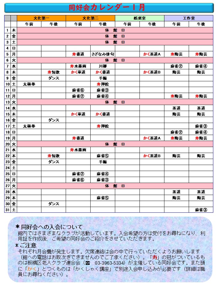 1月の行事への参加申し込みは12月25日(木)からスタートです。「行事予定表1月」中の赤字は有料講座(原則100円)です。