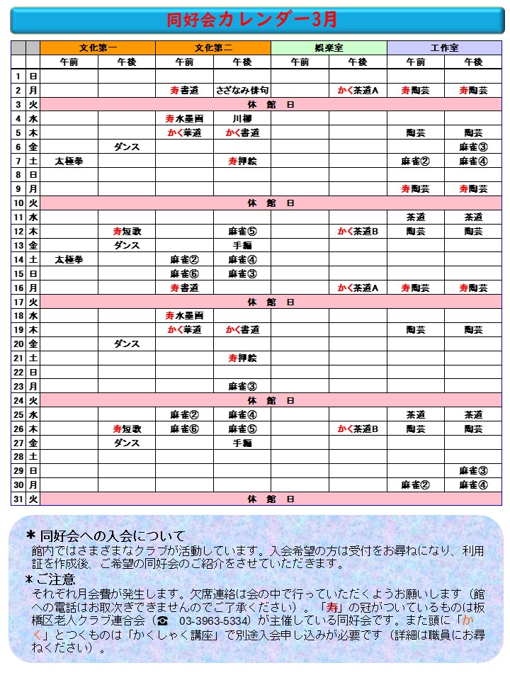3月の行事への参加申し込みは2月25日(水)からスタートです。「行事予定表3月」中の赤字は有料講座(原則100円)です。